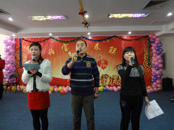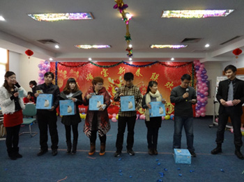 聯歡會還安排了精彩的抽獎環節,大家把自己真誠的祝福提前寫在卡片上,匯集在抽獎箱中,隨著主持人公布的抽獎名單,幸運者帶著開心的笑容上臺領取了獎品,并一一宣讀了自己的祝福語:有的祝愿自己的家人和同事都能健康、快樂;有的祝愿大家在新的2012年工作順利,家庭幸福;也有的祝愿公司基業長青,發展越來越好;還有的祝愿我們偉大的祖國繁榮昌盛。伴隨著大家送上的美好祝福,現場充滿了溫馨與感動。