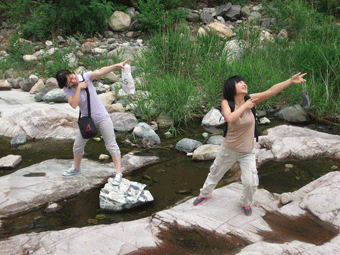 水光瀲滟晴方好,山色空蒙雨亦奇”。用此詩句來形容今日的彩石溪毫不為過,雨后的彩石溪,畫入水中秀,水在畫上流。溪中流水之下如彩石鋪就,溪底一條條石紋五彩紛呈,彩石溪因此而得名。彩石溪景色別致,雖不似“岱頂觀日出”壯麗,更不是什么名勝古跡,只是泰山奇景中一角,卻足以令人趨之若鶩,更有別樣的詩情畫意。彎彎曲曲的溪水像是被彩石染上了顏色,像是一條五彩斑斕的飄帶一直通往山頂。沿溪一路直上,十里山澗,波光瀲滟,奇特地質地貌,猶如潑墨大寫意。身臨其中,讓人不由地贊嘆起大自然的鬼斧神工??茨俏宀拾邤痰木€條隨山勢或舒或展,聽那清澈的流水潺潺,那情那景仿佛置身于世外桃源。脫下鞋子,佇立水中,溪流溫順而清澈。美麗的彩石引得大家駐足欣賞,仔細看水中還會發現聞名遐邇的泰山赤鱗魚以及黑色的小蝌蚪,它們出沒于石隙水藻之間,身影靈巧輕盈,搖曳多姿,為大家的出游增添了很多的情趣。山中的空氣清新甘潤,忍不住來個深呼吸,頓覺心曠神怡,神清氣爽,每一個細胞說不出的舒暢,平日的瑣碎煩亂事情一掃全無,大家的身心得到完全放松。