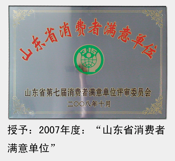 2008年,被山東省消費者協會評為“第七屆山東省消費者滿意單位”