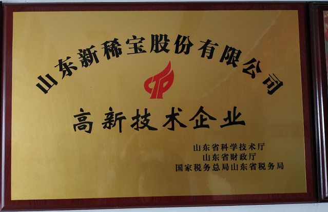 2018年,山東新稀寶股份有限公司被山東省科學技術廳、山東省財政廳、國家稅務總局山東省稅務局評為“高新技術企業”