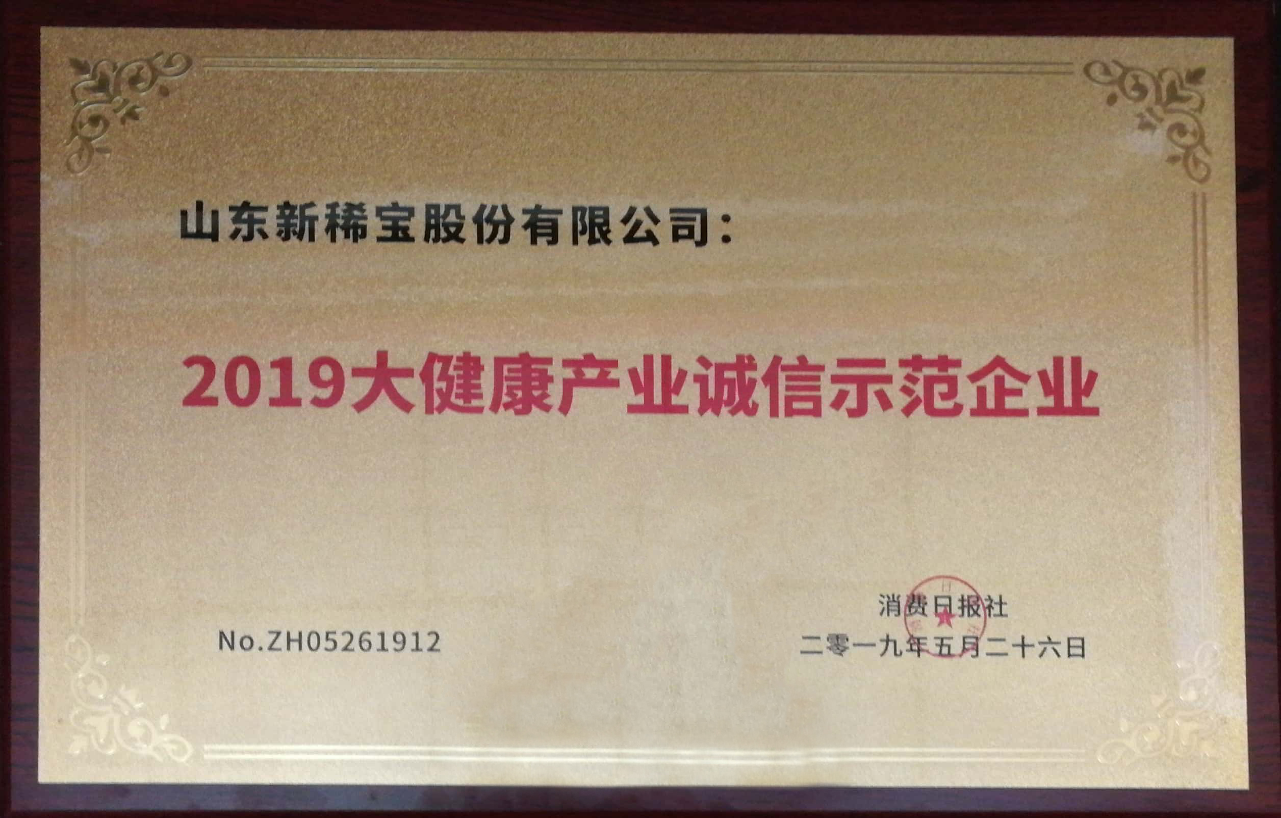 被消費日報社評為“2019大健康產業誠信示范企業”