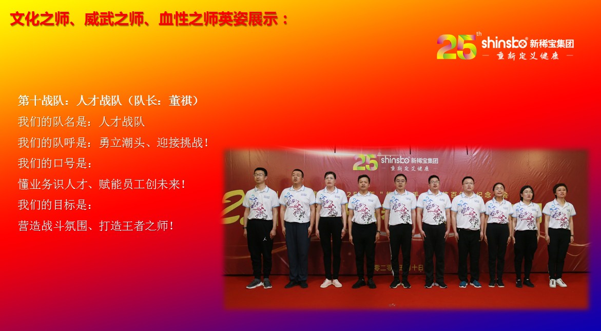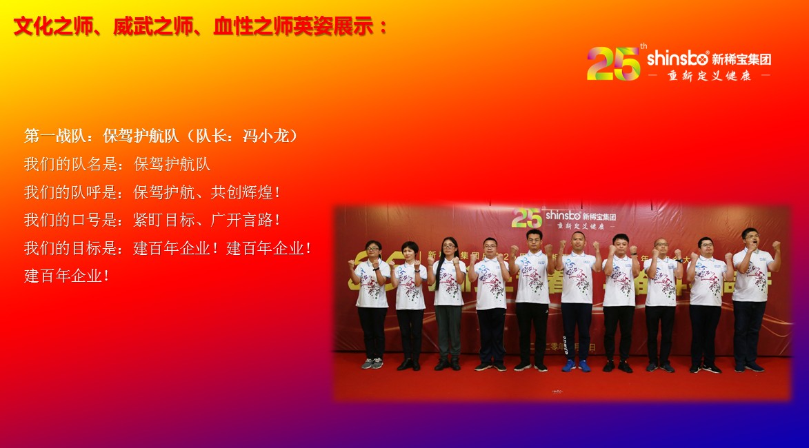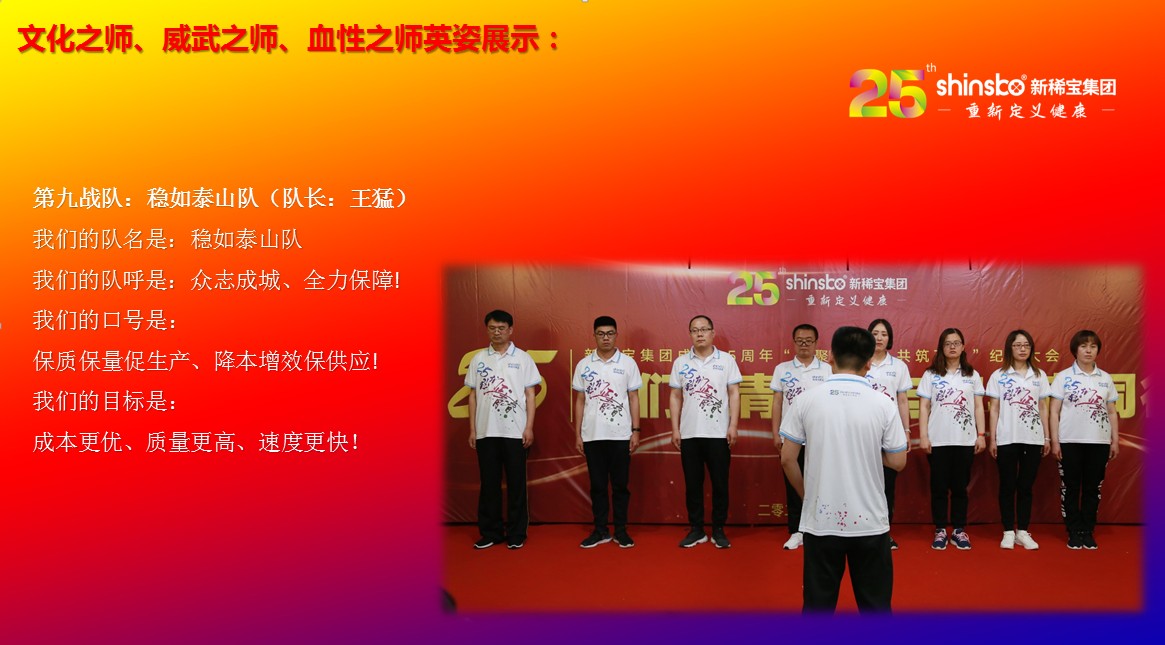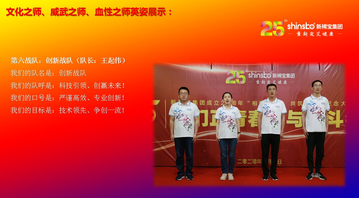 在文化儀式后緊接著舉行了隆重的“文化之師、威武之師、血性之師” 誓師大會。各戰隊步入會場就被熱烈的現場氛圍所感染,主屏展架抒寫“25我們正青春”與奮斗者同行的格言,大紅背景墻點綴出新稀寶集團“相聚攜手 共筑百年”25周年紀念大會”活動主題,兩條大氣宏偉、耀眼奪目橫幅 “增強緊迫感、聚焦主戰場、打好翻身仗;抓住新機遇、創造新優勢、再創新輝煌”為誓師大會營造了良好戰斗氛圍,使各戰隊、各戰將從視覺上、思想上、感知上,感受到公司的凝聚力、向心力、變革力、戰斗力。