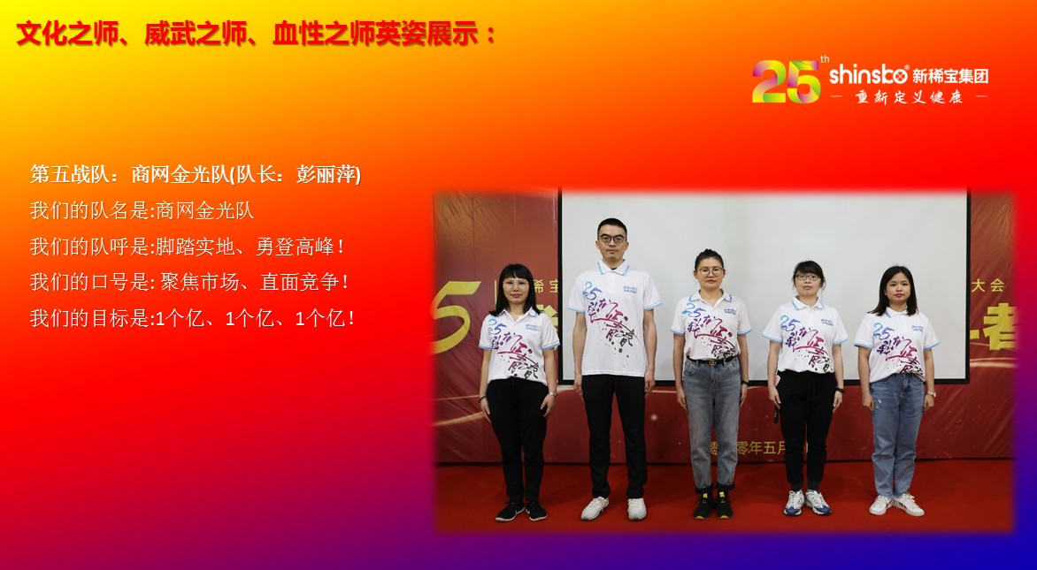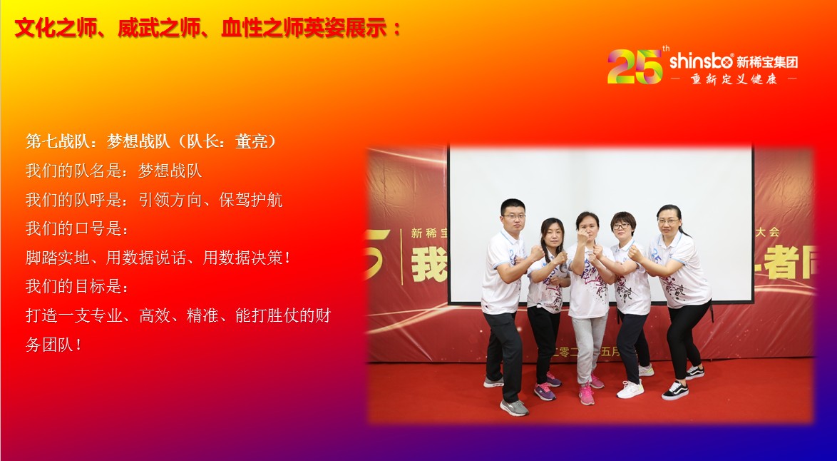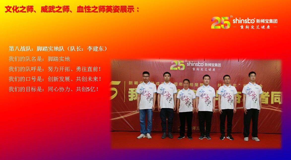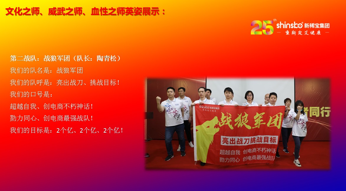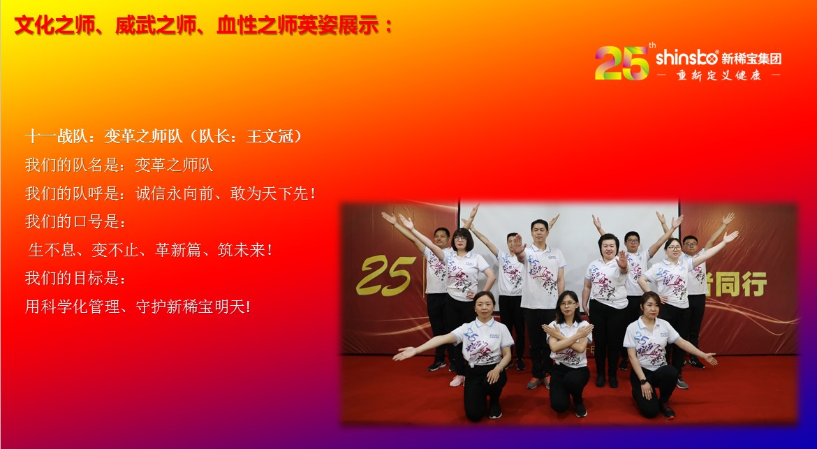 在文化儀式后緊接著舉行了隆重的“文化之師、威武之師、血性之師” 誓師大會。各戰隊步入會場就被熱烈的現場氛圍所感染,主屏展架抒寫“25我們正青春”與奮斗者同行的格言,大紅背景墻點綴出新稀寶集團“相聚攜手 共筑百年”25周年紀念大會”活動主題,兩條大氣宏偉、耀眼奪目橫幅 “增強緊迫感、聚焦主戰場、打好翻身仗;抓住新機遇、創造新優勢、再創新輝煌”為誓師大會營造了良好戰斗氛圍,使各戰隊、各戰將從視覺上、思想上、感知上,感受到公司的凝聚力、向心力、變革力、戰斗力。