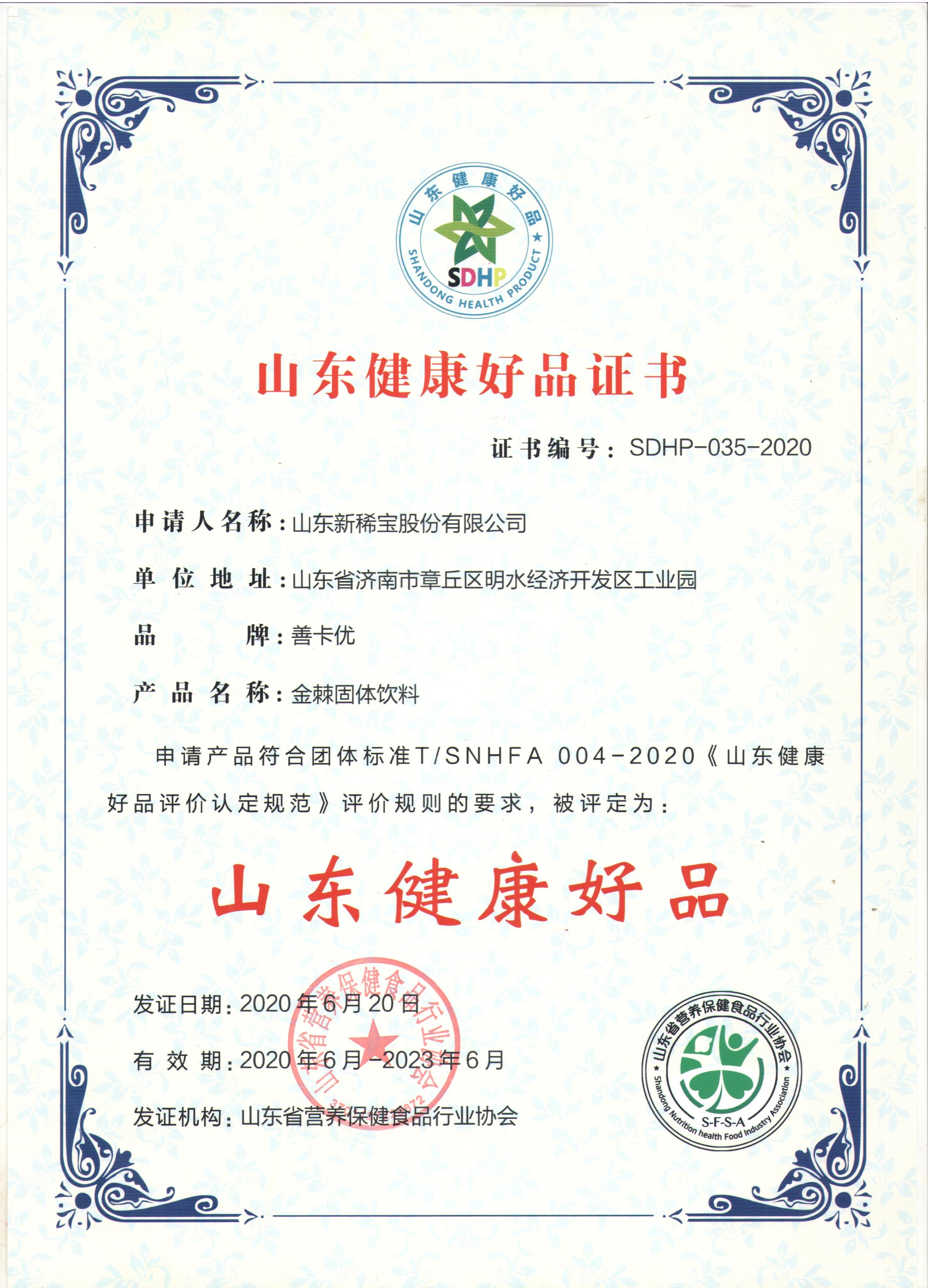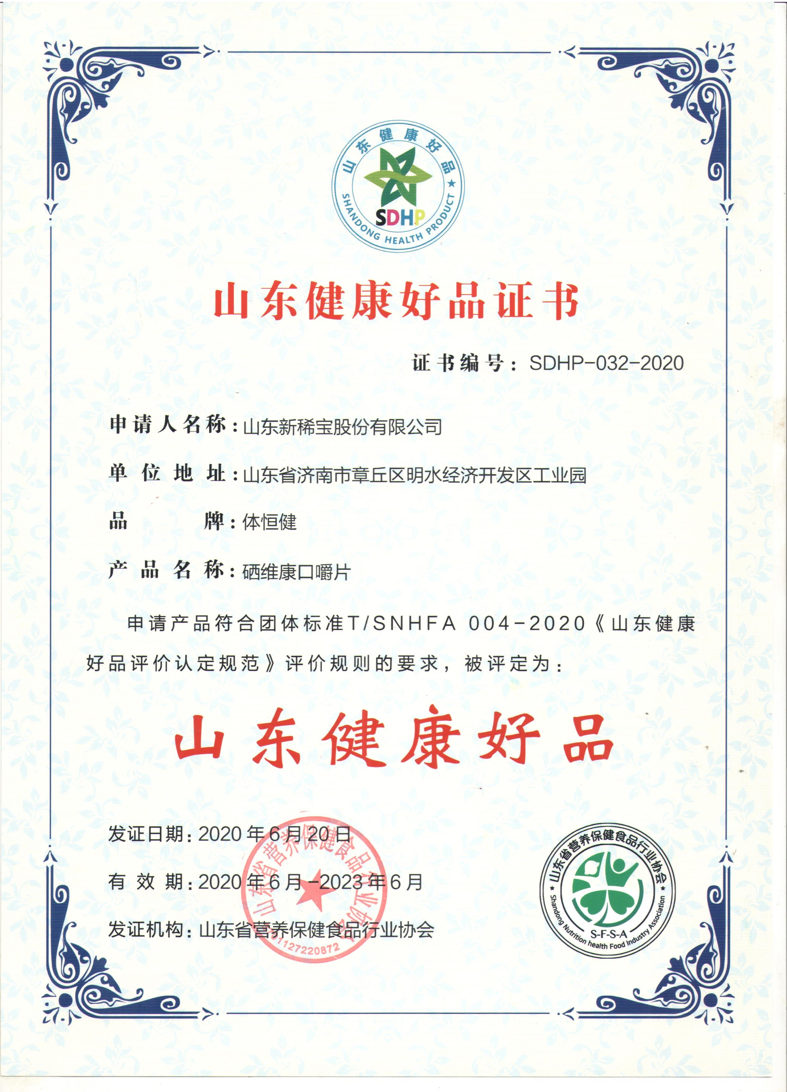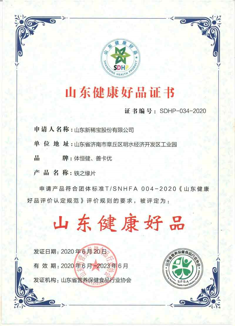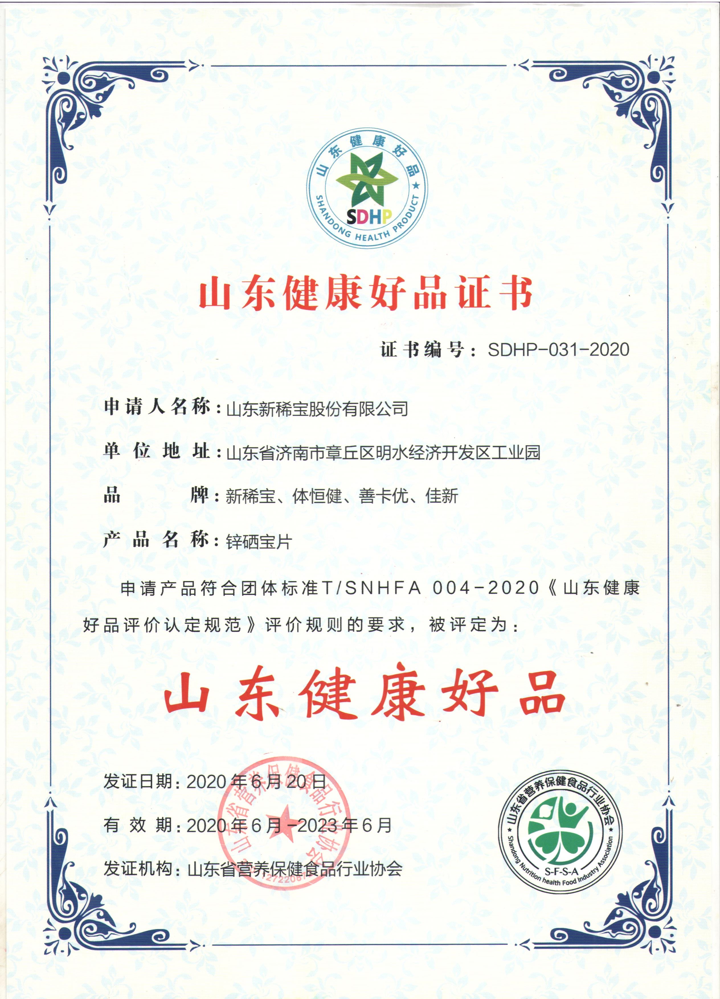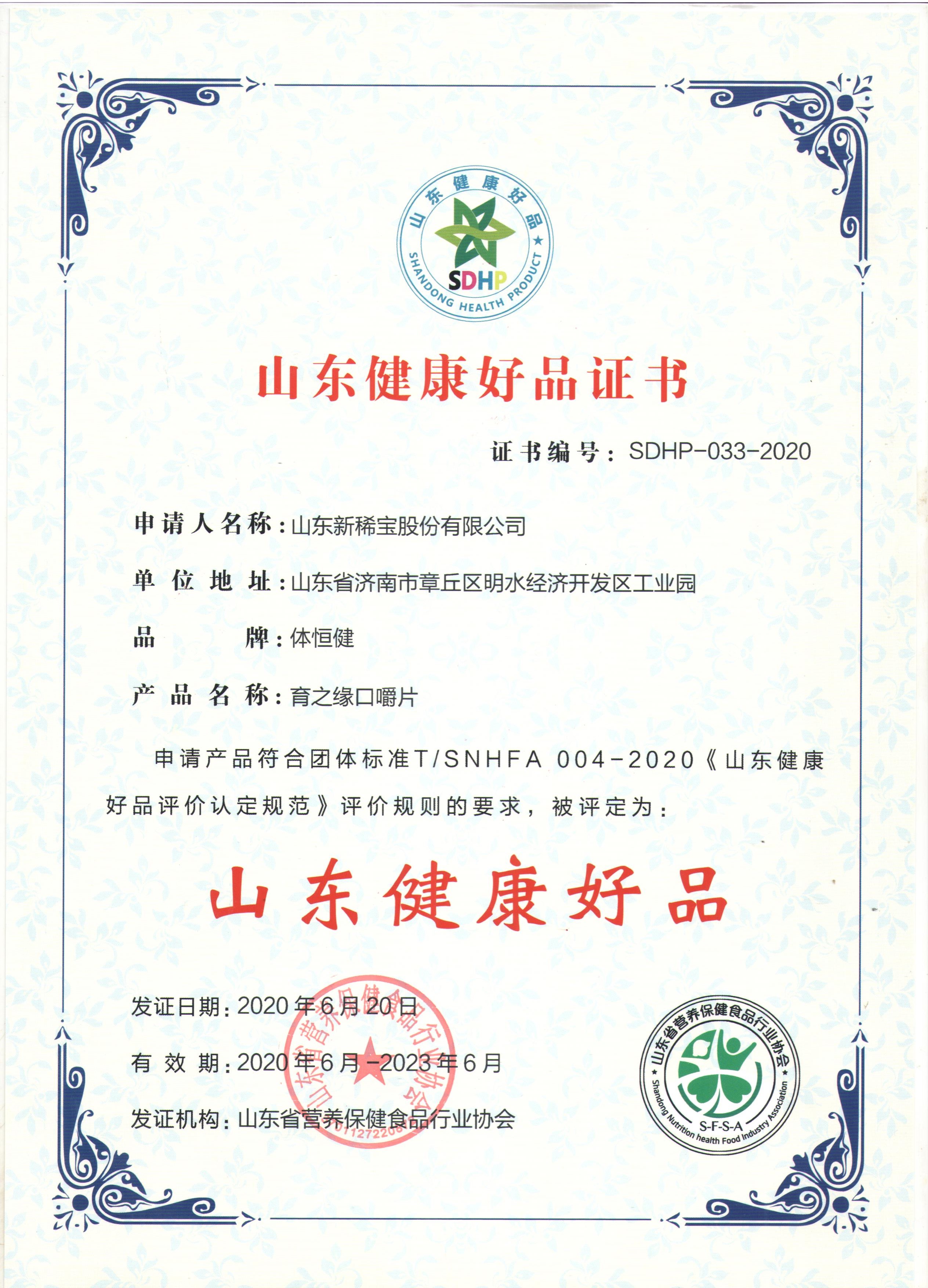 月鋅硒寶片、鐵之緣、硒維康口嚼片、育之緣口嚼片、金棘固體飲料五款產(chǎn)品獲得山東健康好品證書(shū)