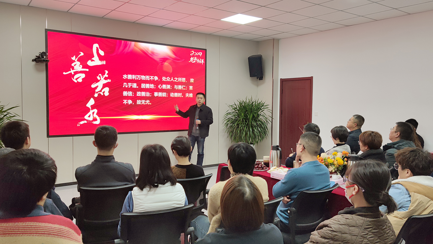 “看了2023財年的業績,我為大家的成績感到自豪。”集團董事長王猛也對員工的工作成果表示肯定。接著王猛從《老子》的“上善若水”為出發點,詳細講解了“水善利萬物而不爭,處眾人之所惡,故幾于道。居善地,心善淵,與善仁,言善信,政善治,事善能,動善時。夫唯不爭,故無尤。”所蘊含的生活哲學,并融合實際生活和工作,向大家傳授了如何從心出發,做到知行合一,激發自己的更大的潛力。